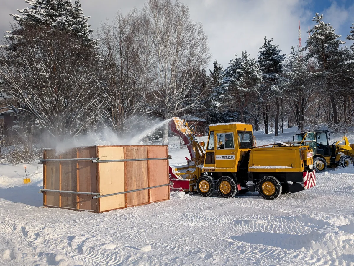 2026/01/15(木)雪の独居房 製作 ②本日から雪の独居房の完成までの製作過程をご紹介していきます。 雪の独居房は看守長屋前に展示予定です! まずは雪を囲いの中に入れて、1週間ほど置きます。 1週間置いて囲いを外したものがこちらです。囲いがなくてもしっかり固まっていますね! 看守長屋から見て正面と左側をくり抜いていきます。 管理課の皆さんが穴をあけている様子です。 写真では見えにくいですが、正面と左側の穴はつながっている状態です! 本日の製作日記はここまでです!明日以降もお楽しみに!