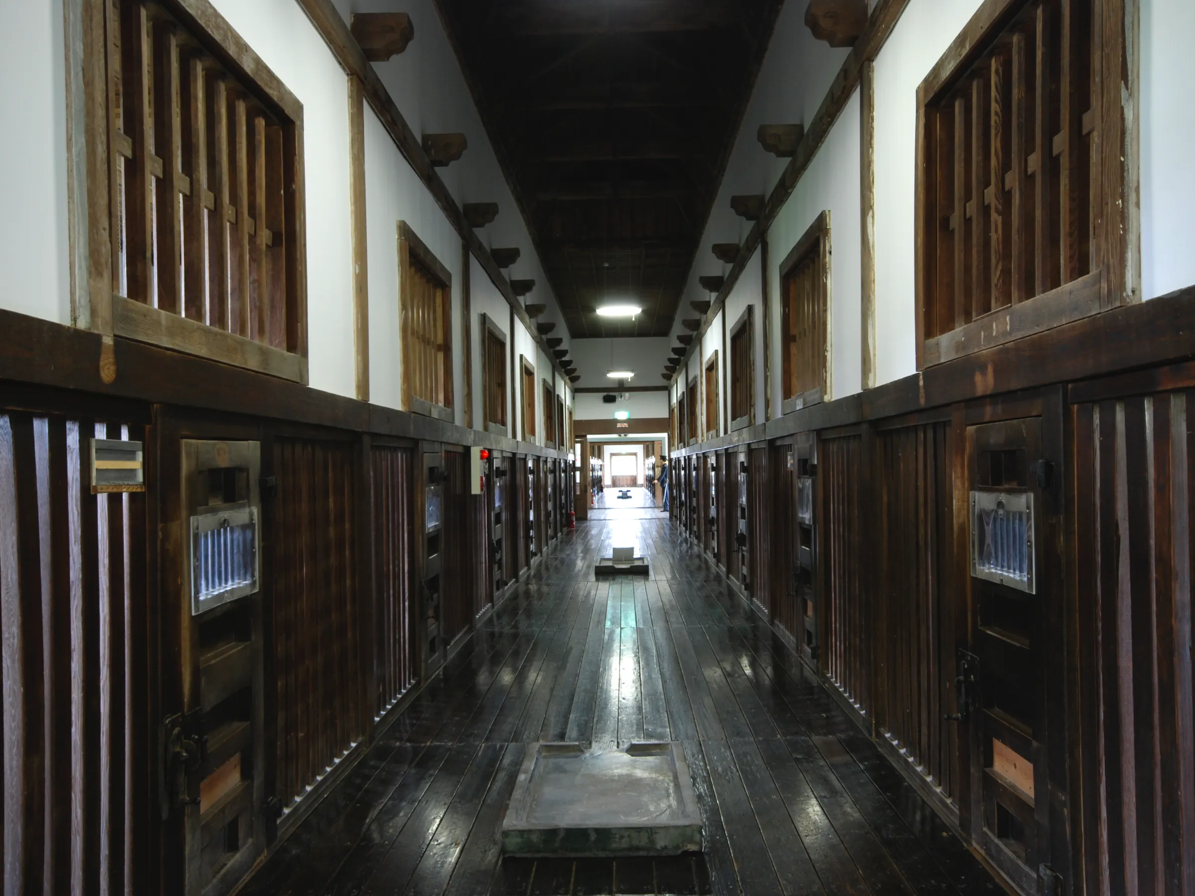 中央見張所は床を板張、天井は鏡天井で二重に蛇腹を巡らして折り上げ、壁は漆喰塗りで竪板張の腰壁を巡らしている。内部は中央を通路とする向かい房で、六畳の広さの雑居房が各20房となっている。