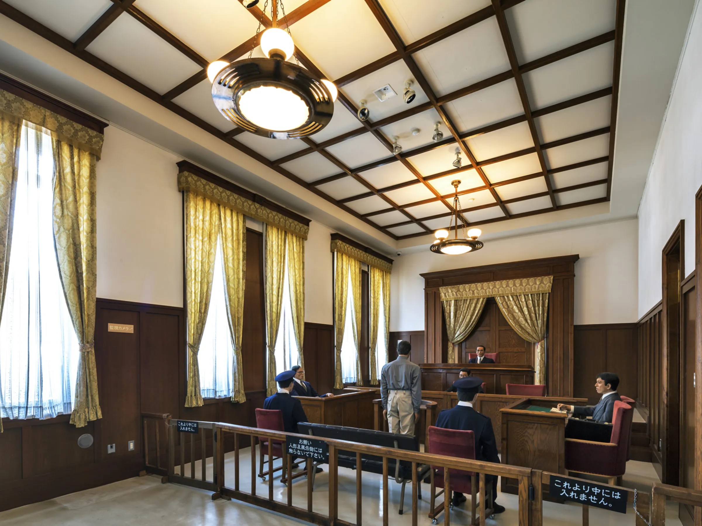 この建物の外観は、明治33年から昭和27年まで使われた旧網走区裁判所の外観を再現していますが、内部の移築物は昭和27年から平成3年まで使用されていたものを配置し、広さ高さを元通りに復原し、法廷内部の机や椅子、照明器具、カーテン等は実際に使用されていたものを展示しています。