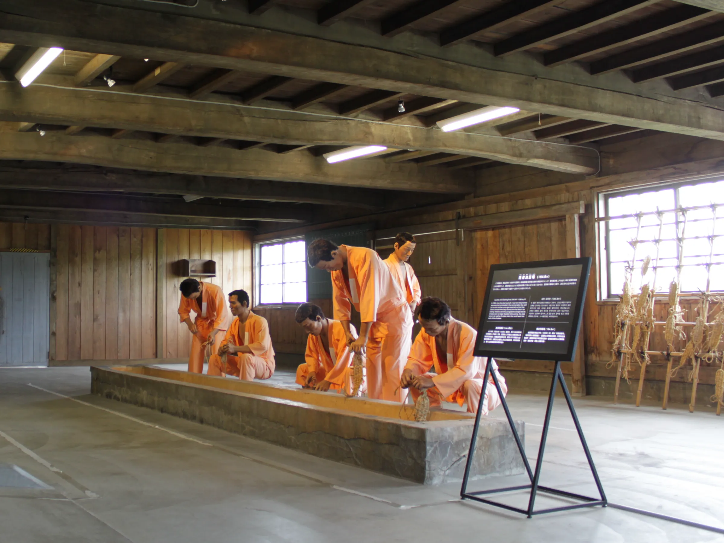 外壁は下見板張。北側は足洗場で長い足洗槽があり、南側は洗濯場となっている。2階は雑品庫、衣服庫、図書庫で、床は全面板張り、頂部に明り取り窓を巡らし、棹縁天井の外側にはキングポストトラスが現れている。