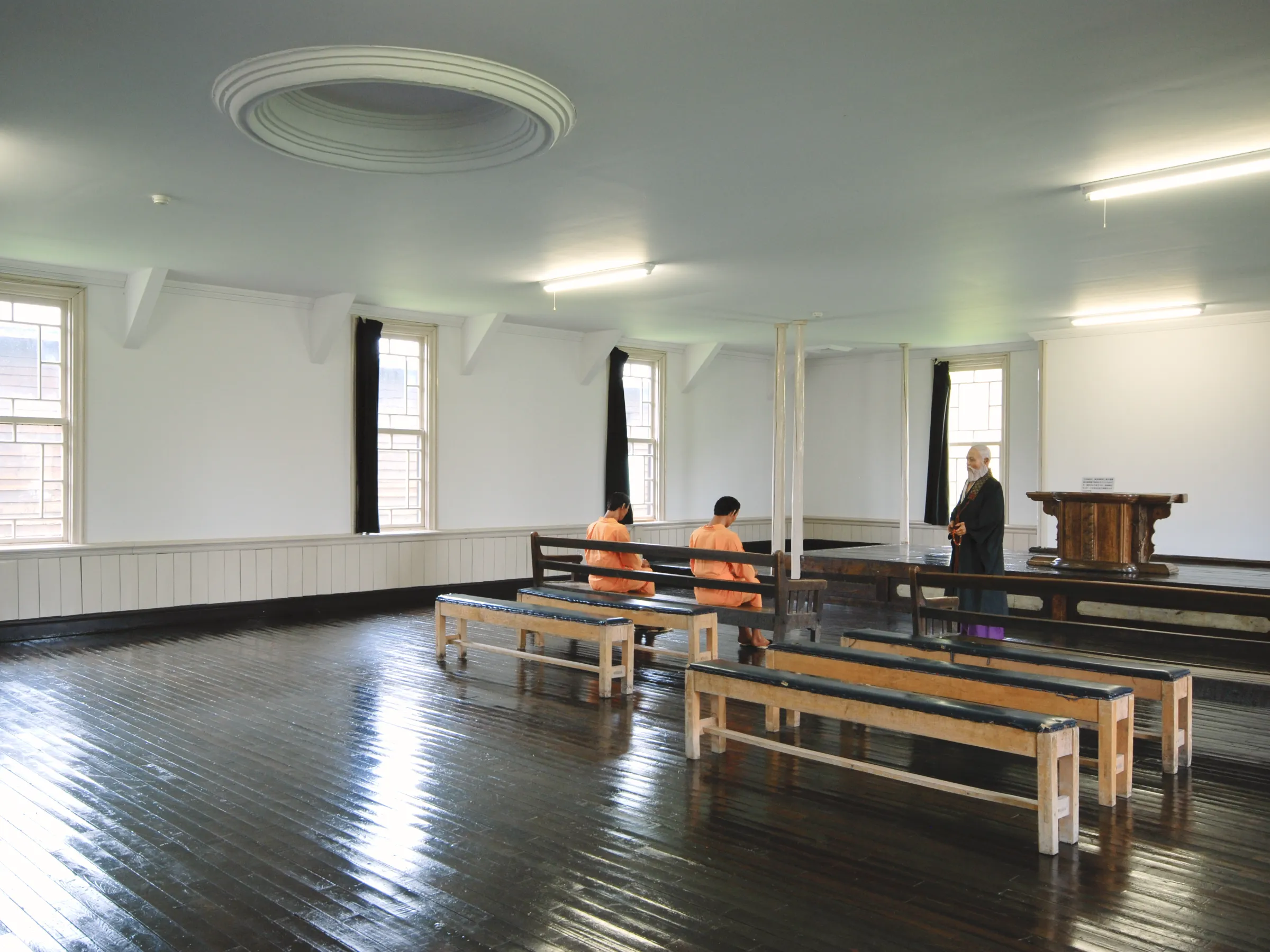 教誨堂は板敷きの一室で、床を高めて舞台を設け、内部の壁は漆喰風仕上げで上下ガラス窓を並べ、竪板張の腰壁を巡らしている。天井には丸形の中心飾りや角型の換気口がある。小屋組はクイーンポストトラスである。