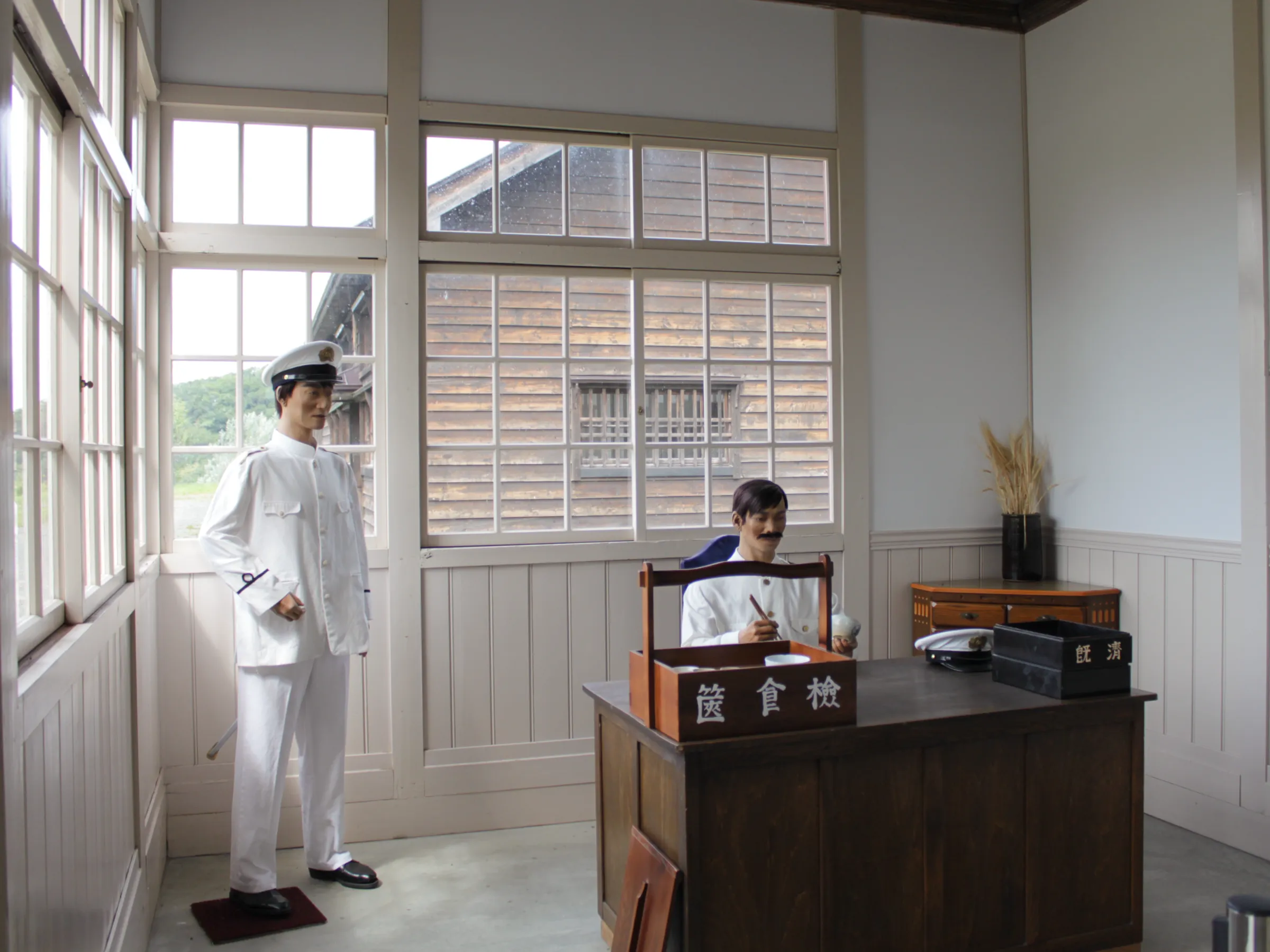 ผนังภายนอกกรุด้วยไม้ซ้อนเกล็ด โครงสร้างหลังคาใช้โครงถักแบบคิงโพสต์ ส่วนที่ยื่นออกมาจากผนังหลักของอาคารใช้โครงหลังคาแบบญี่ปุ่นดั้งเดิมที่เรียกว่า วาโกยะ ทางเข้าหลักตั้งอยู่กึ่งกลางด้านทิศใต้ของอาคาร มีทางเดินเชื่อมไปยังด้านทิศเหนือ ภายในอาคาร ด้านทิศตะวันออกเป็นห้องสำนักงาน ด้านทิศตะวันตกเป็นห้องเวรกลางคืนและห้องพัก พื้นอาคารปูด้วยอิฐหรือคอนกรีต เพดานเป็นเพดานเรียบทำจากแผ่นไม้ขัดเรียบ และติดบัวที่รอยต่อระหว่างผนังกับเพดาน