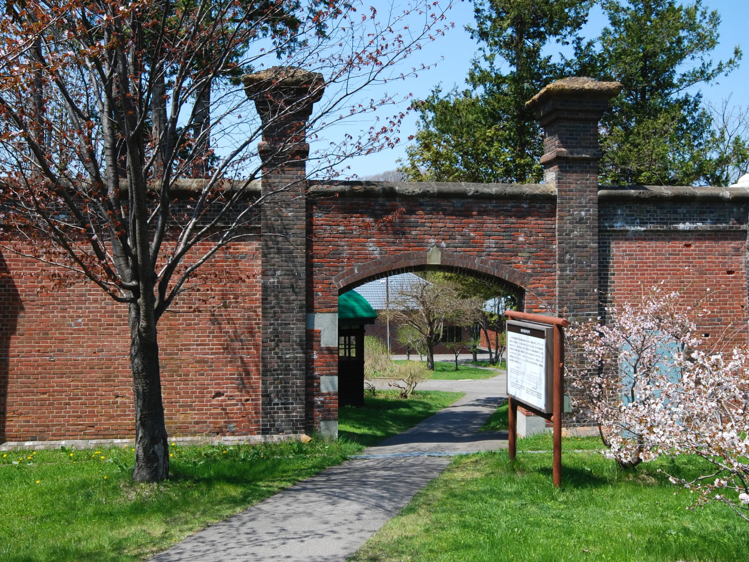 ประตูทางเข้าด้านหลังของเรือนจำอาบาชิริ ซึ่งเรียกกันทั่วไปว่า “ประตูใช้ผ่าน” เป็นประตูแห่งแรกที่เริ่มใช้อิฐแดงในการก่อสร้างประตูและกำแพง ในปี ค.ศ. 1919